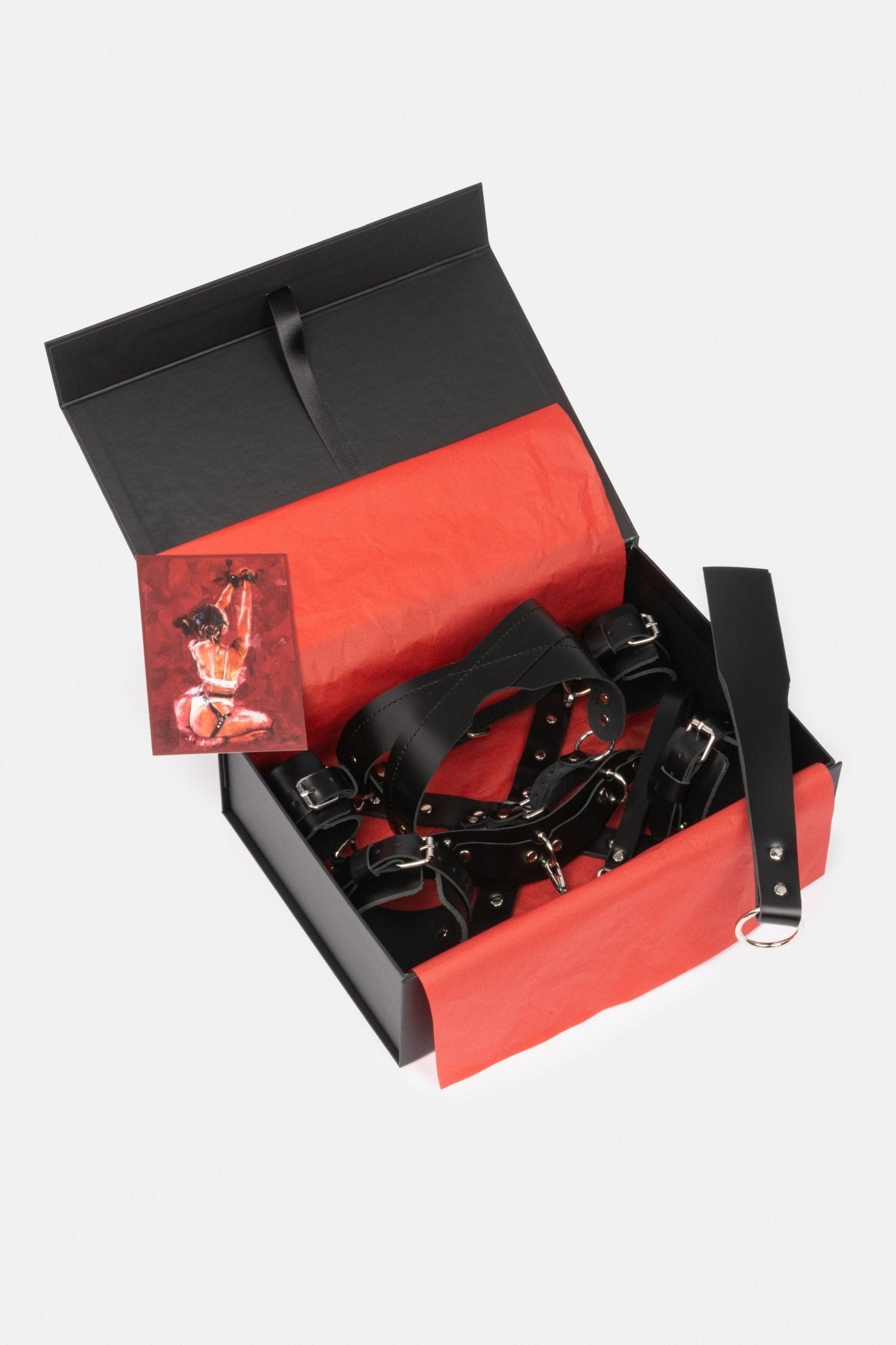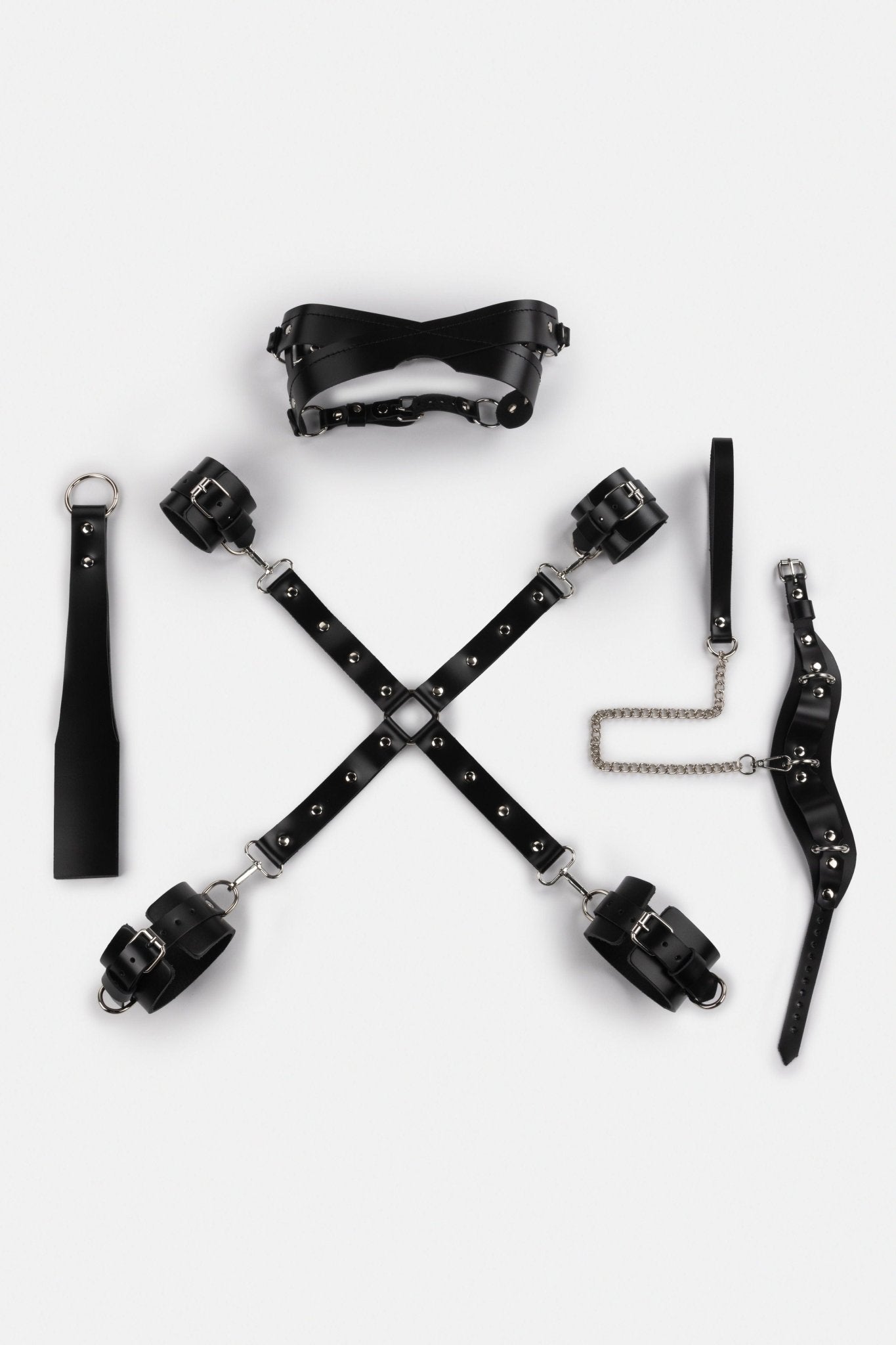 - Leather bondage set: handcuffs and leg cuffs